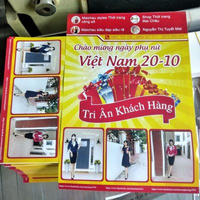 Công nghệ: In kỹ thuật số Kích thước: 10 x 20.5 (cm), 14.5 x 20.5 (cm), 20.5 x 29.7 (cm) Chất liệu: Giấy Couche định lượng 120gms, in 4 màu, 2 mặt Gia công: Xén thành phẩm BẢNG GIÁ IN TỜ RƠI Công nghệ